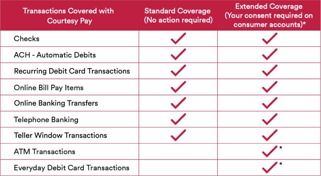 - Giving us your consent to pay everyday debit card and ATM overdrafts on your consumer account (Extended Coverage) may result in you incurring Courtesy Pay Fees for transactions that we would otherwise be required to pay without assessing a Courtesy Pay Fee. However, this would allow us to authorize transactions up to the amount of your Courtesy Pay limit. If you consent to Extended Coverage on your consumer account, it will remain on your account until it is otherwise withdrawn.